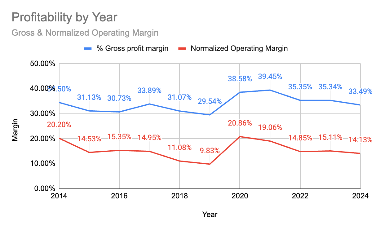 Between 2020 and 2022 profitability benefited from COVID, mainly from higher sales from lab tests which improved operating income.