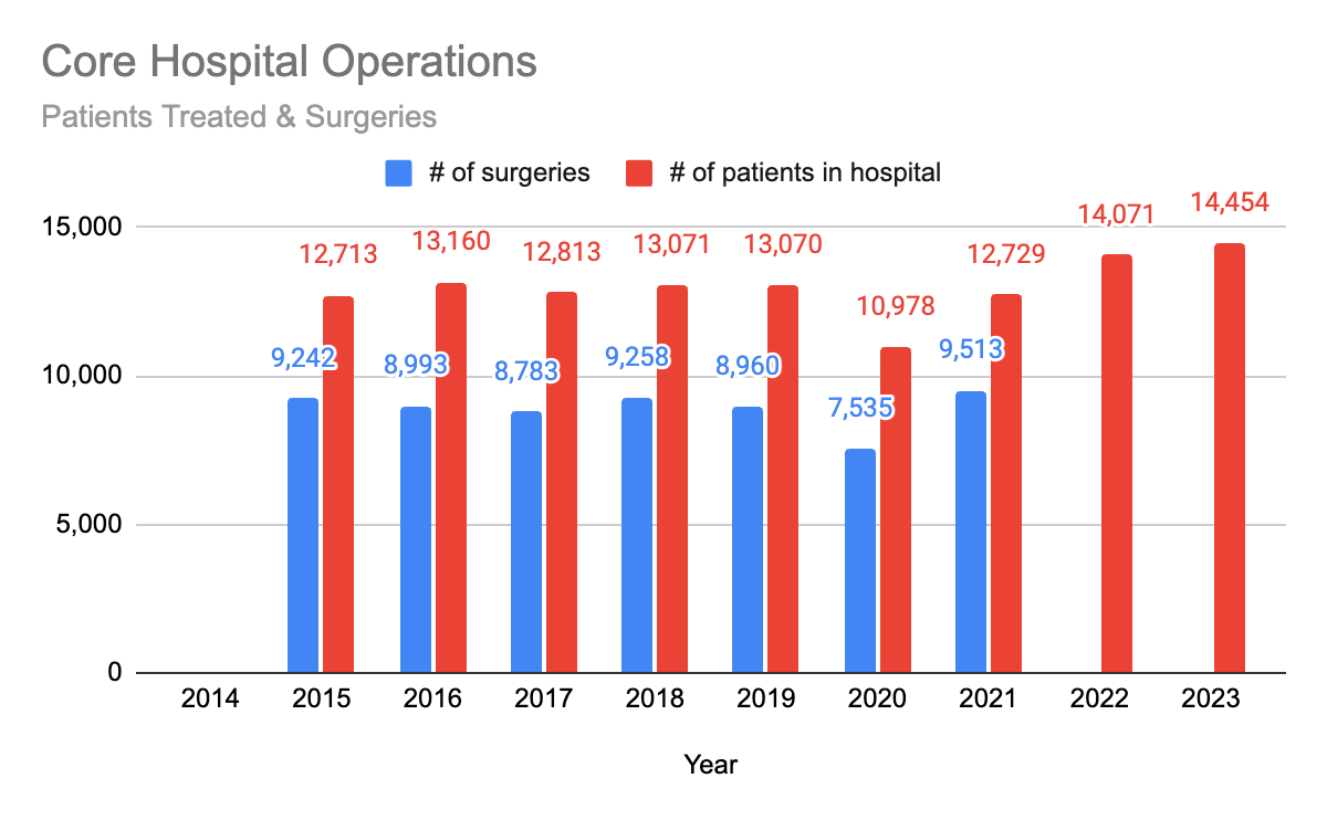Operating capacity of general hospital services is determined by the number of beds and surgical rooms available in the hospital. Think of this as the limiting factor driving hospital sales. As such, an important indicator for hospitals is the occupancy rate. The higher the number the better because fixed costs can be spread out more efficiently. The occupancy rate in 2023 was 68%, slightly higher than the average since 2014 of 66%.