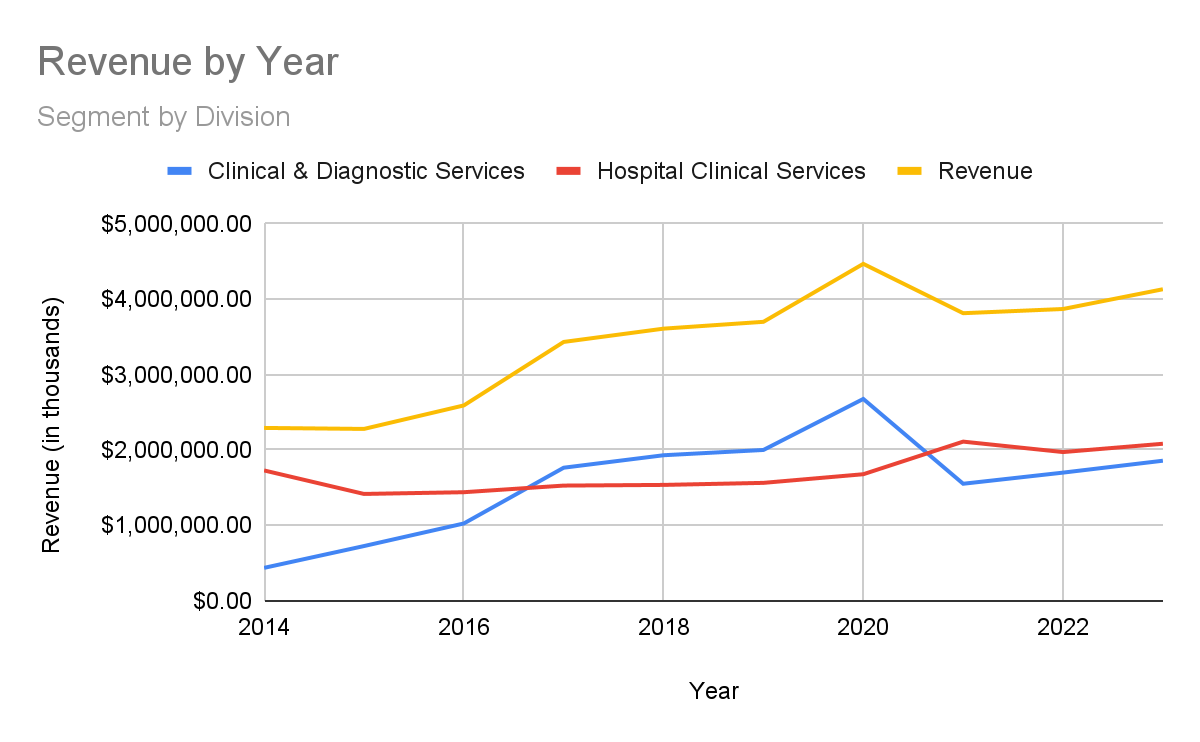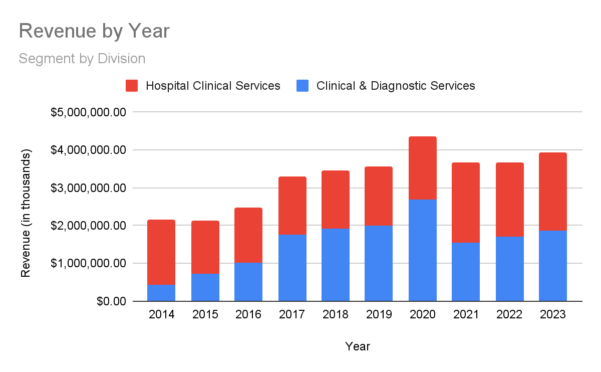 Revenue from the clinical and diagnostic services division grew from $437 million in 2014 to $2,676 million in 2020. This growth was primarily driven by: