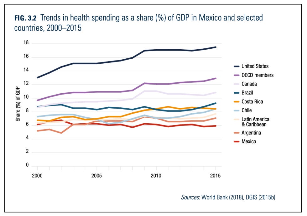 Mexico has consistently had the lowest level of health spending as a proportion of GDP in the group of countries with similar or higher levels of development in the Americas, such as Argentina, Brazil, Canada, Chile, Costa Rica and the USA.