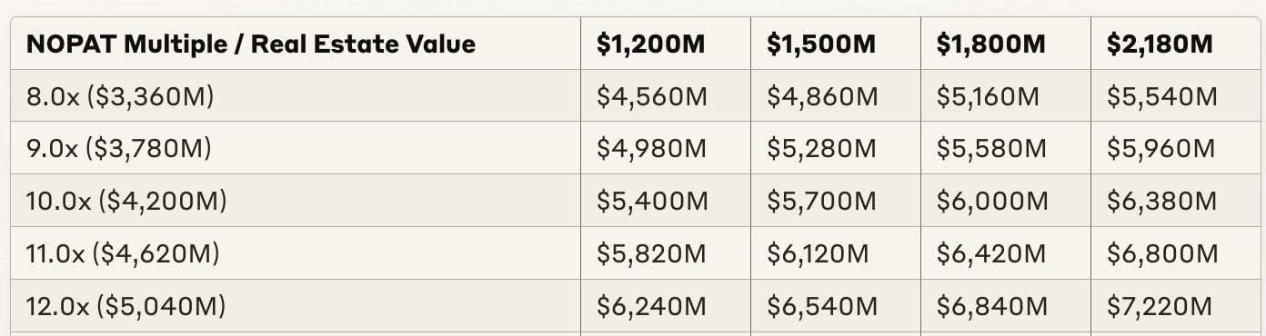 The following sensitivity table shows the possible ranges of value for the company, considering different earnings multiples and overall real estate values.