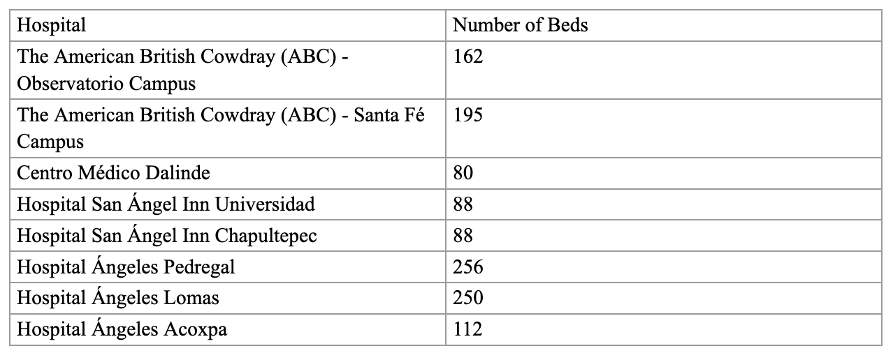 The company’s hospital complex has 189 beds and 20 surgical rooms and is located in the southern part of Mexico City in the Tlalpan district (within walking distance of Estadio Azteca).