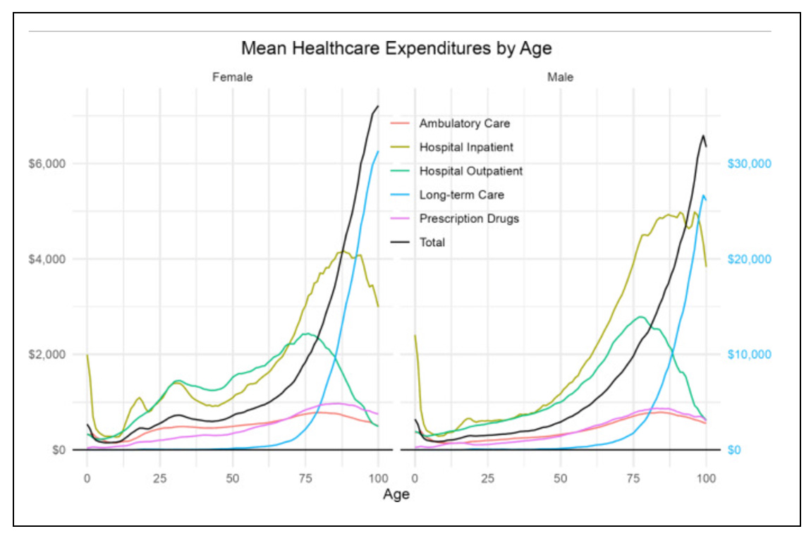 Healthcare spending tends to increases exponentially with age. Expenditures rise sharply after age 55, driven by hospital inpatient specialty services, long term care, and prescription drugs.