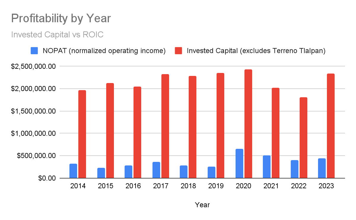 In 2014 the book value of “Terreno Tlalpan” was MXN $695 million. Adjusted for inflation this land is now worth around MXN $1,100 million. Moreover, in 2021 the company received an appraisal for this property of MXN $3,061 million. I think a midpoint between these values is a reasonable estimate for what the property is worth, the mid-point being $2,080 million.